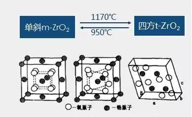在常壓下,純 ZrO2 共有三種晶態:單斜(Monoclinic)氧化鋯(m-ZrO2)、四方(Tetragonal)氧化鋯(t-ZrO2)和立方(Cubic)氧化鋯(c-ZrO2),上述三種晶型存在于不同的溫度范圍,并可以相互轉化: