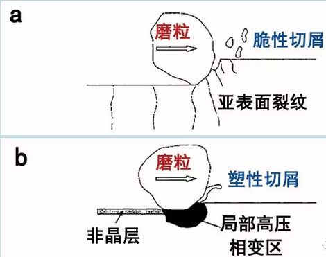 兩種脆性材料的去除機(jī)理:a脆性斷裂去除,b塑性流動去除