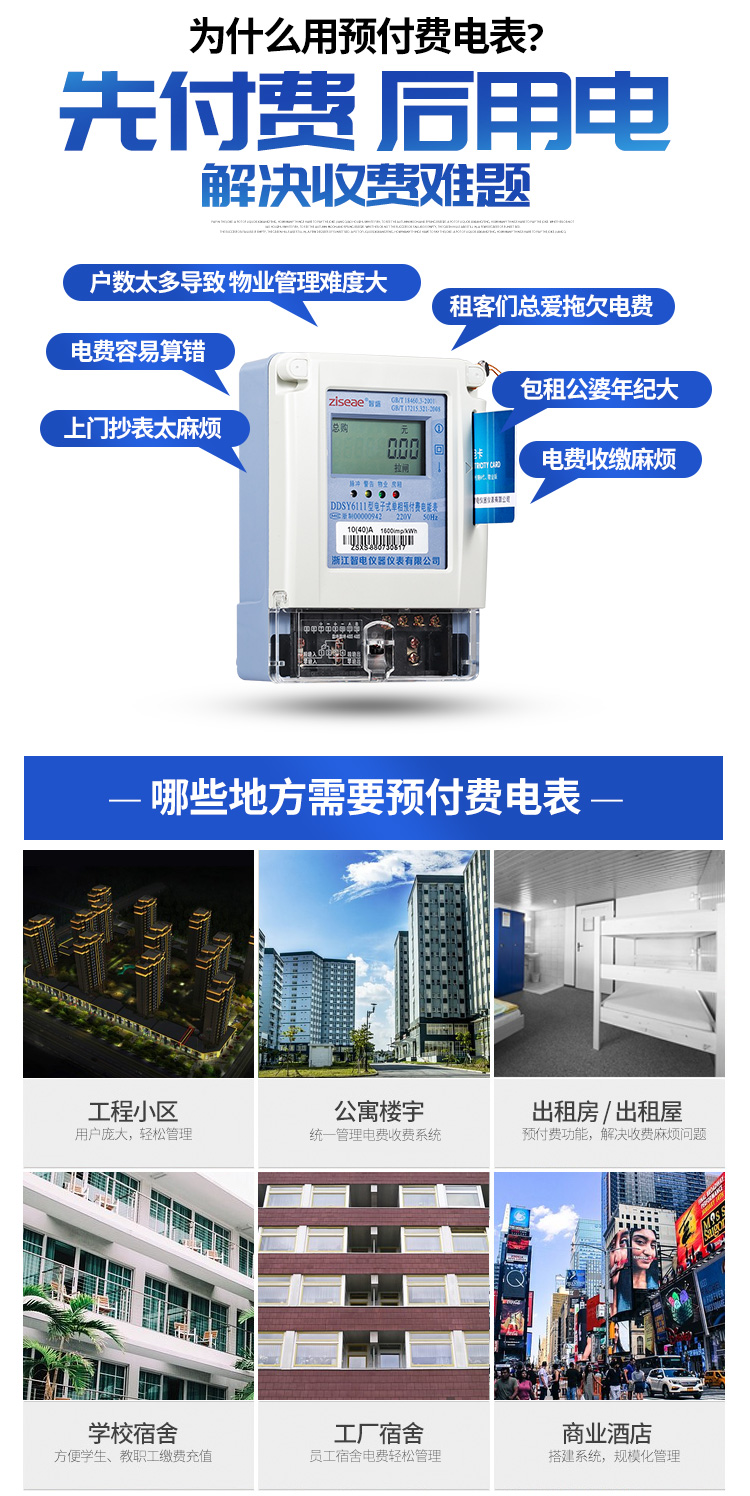 (4)預付費電度表適用的場所:工程小區用戶-龐大輕松管理,公寓樓宇-統一管理收費系統,出租房或出租屋-預付費功能解決收費麻煩問題,學校宿舍-方便學生教職工收費充值,工廠宿舍-員工宿舍電費管理,商業酒店-搭建系統規?;芾淼染唧w如下。