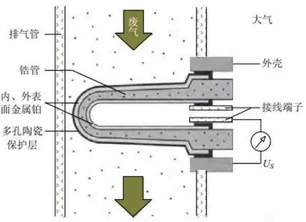 發動機排出的廢氣從氧傳感器的端部經過并與鋯管的外表面接觸,空氣從傳感器尾部的通氣孔進入鋯管的內表面。在溫度超過300℃時氧發生電離,根據ZrO2的測氧原理,由于大氣中的氧氣比廢氣中的氧氣多,因而氧離子從大氣側向廢氣側擴散,兩側離子的濃度差產生電動勢,此時鋯管相當于一個微電池,向外輸出電壓信號。鋯管內外表面氧濃度差越大,輸出電壓信號也越高。